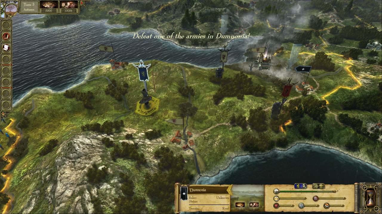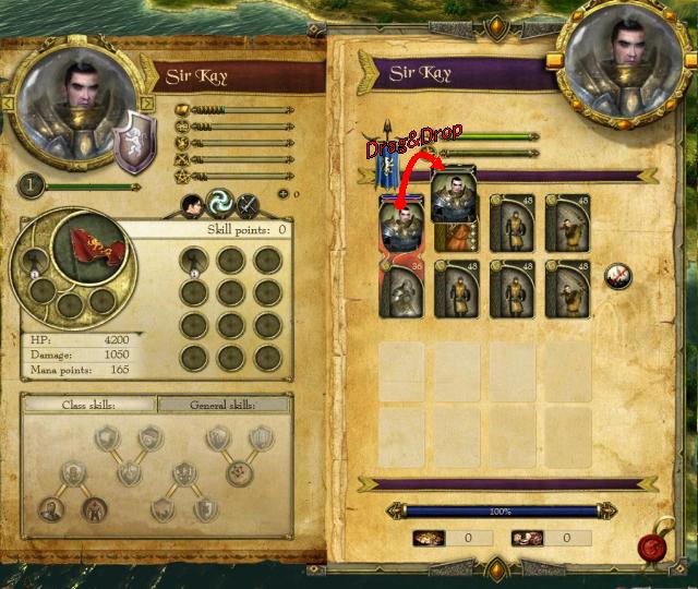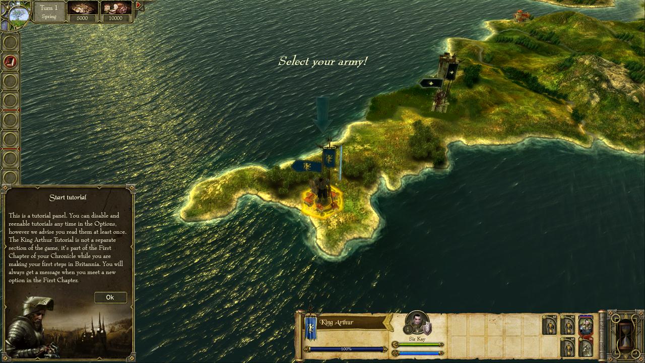画面説明:部隊をクリックすると、画面下部に部隊詳細が表示される。顔写真のあるSir Kayが部隊のLeader。その下の黄緑のバーが士気。青のバーが移動力(これはマップ上の部隊の旗の横についている青く光るゲージと同じ)。そして、その左にある紺色のバーに100%と書かれているのがStrength(軍隊の項目で説明)。