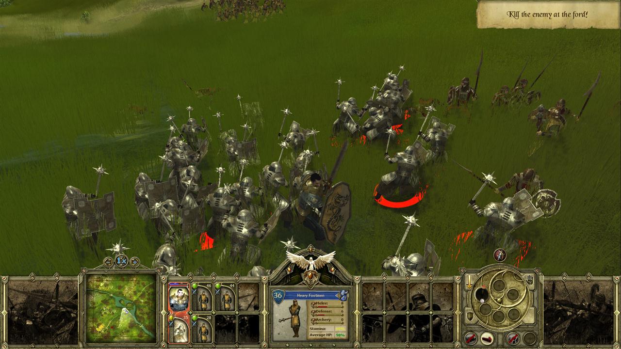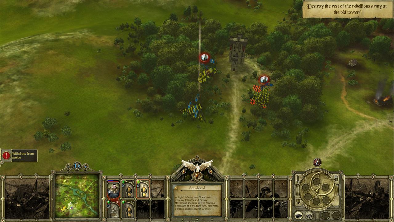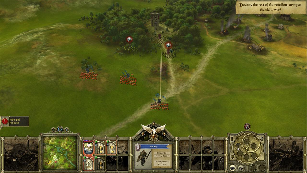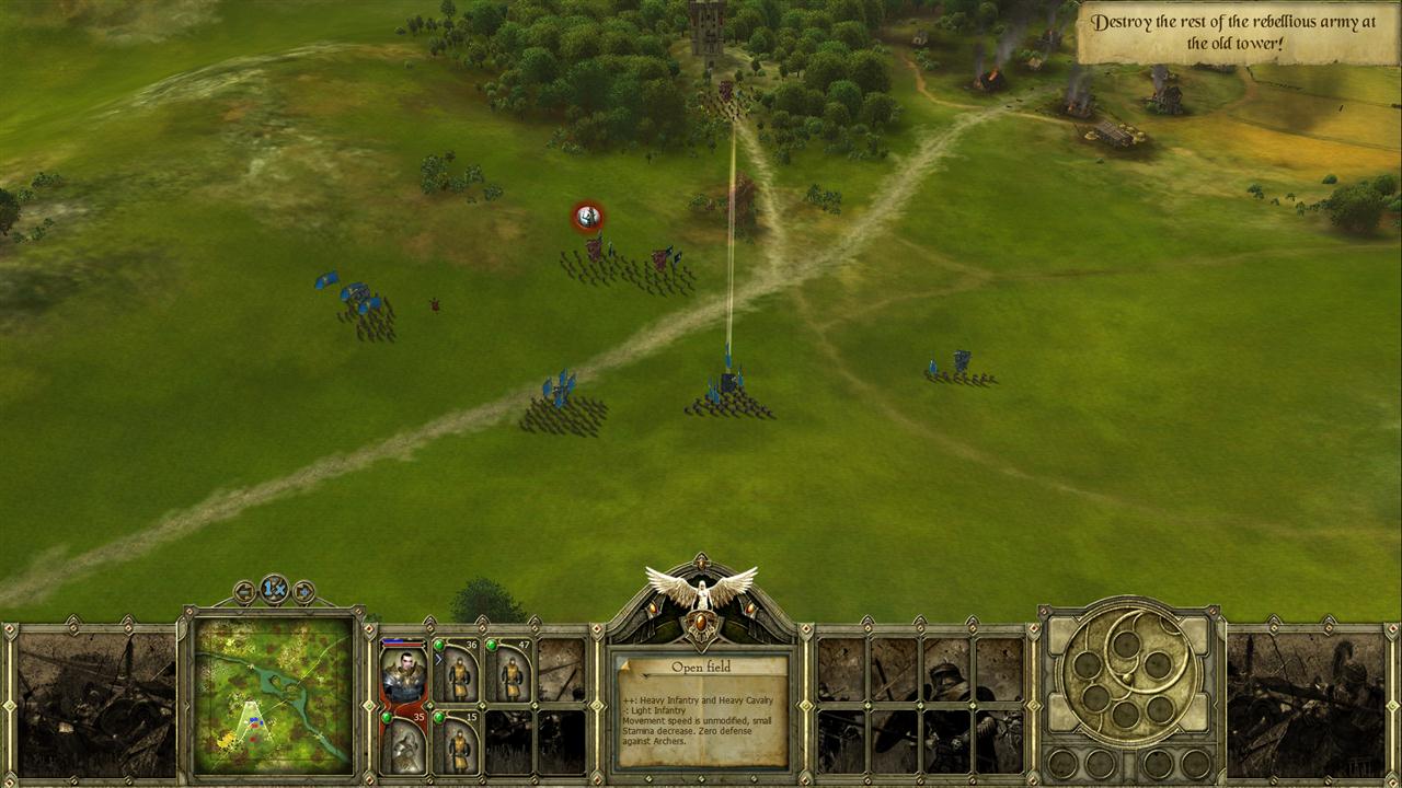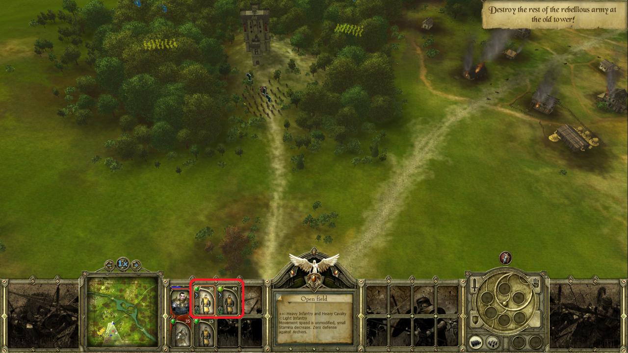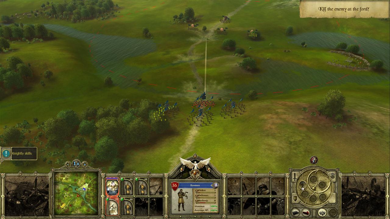 例えば右端の部隊に全部隊で突っ込むと、左の弓兵の射撃が止まらない。敵弓隊3つに、こちらの軽歩兵3つをそれぞれぶつける。これにより強力な射撃攻撃を封じる。敵の白兵ユニットには、Sir Kay率いる重歩兵をぶつける。