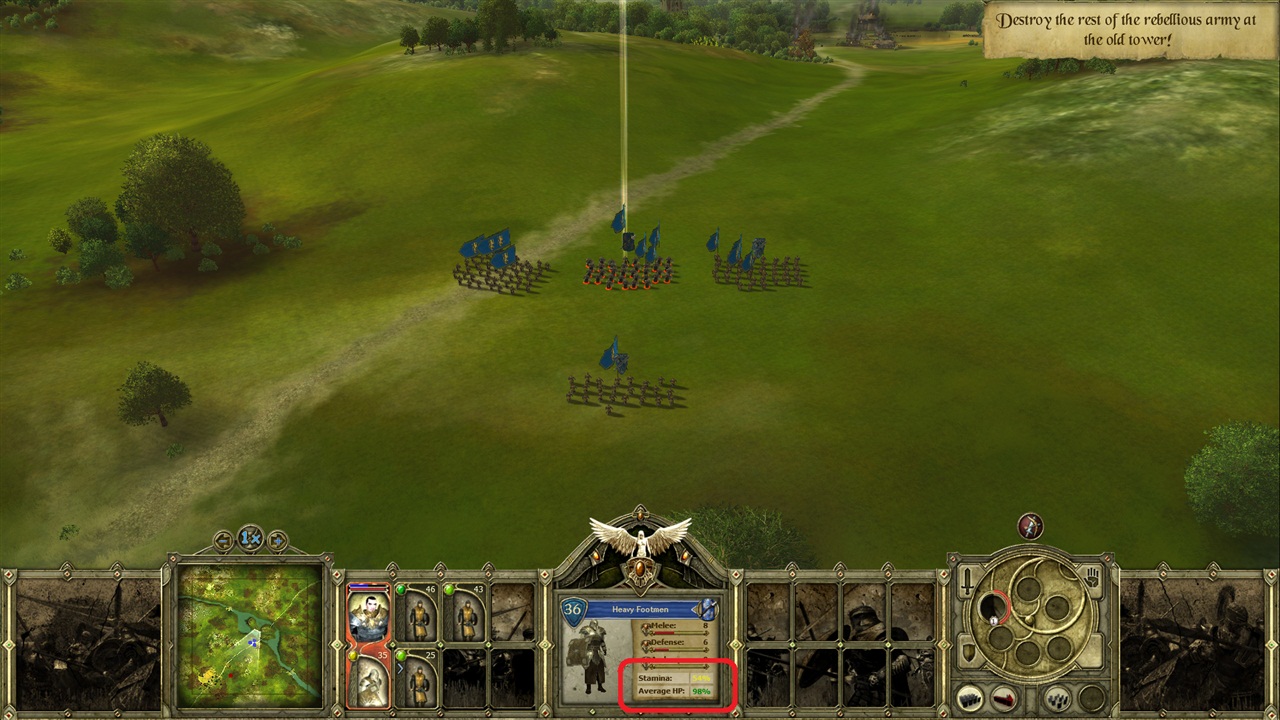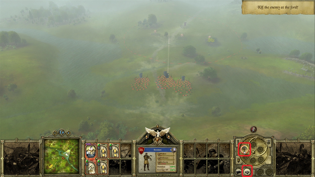 まずは印のある位置まで移動。クリックやドラッグによる範囲選択で部隊を選択し、移動先を右クリックすると移動開始。右ダブルクリックをすると、Staminaを消費するが走って移動できる。