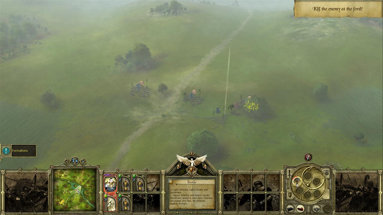 画像説明:(左)霧で分かりづらいが、敵弓隊は3つとも、白兵戦に持ち込まれ射撃を封じられている。鈍足な重歩兵がやっと、△形のWedge陣形で敵歩兵に突っ込むところ。