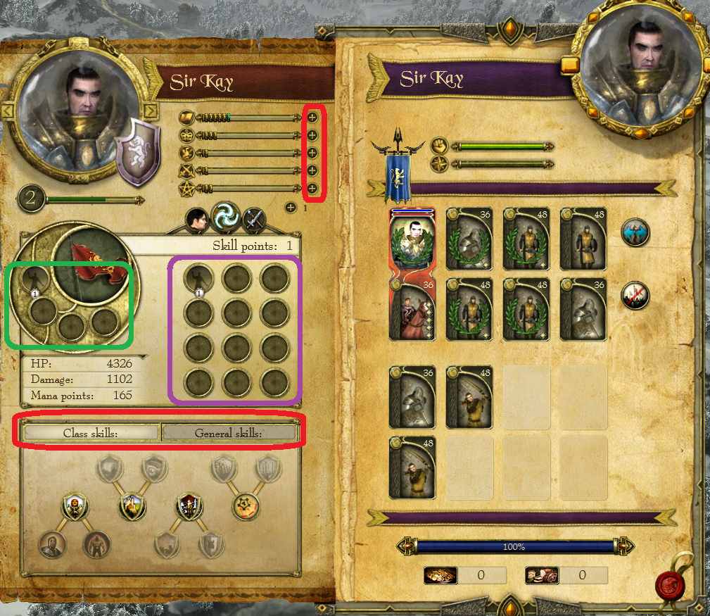 ・下がSkillの習得/Lv-upで、赤枠内のClass SkillsとGeneral Skillsのタブに分かれる。この違いはHeroの説明項目で説明。新しくスキルを習得する場合には、これらのタブの中から欲しいのを選んでダブルクリック。
