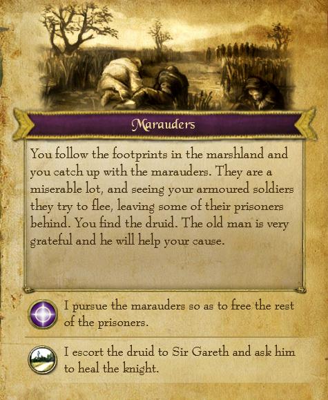 ドルイドのおかげでSir Gareth復活、しかし、完治するまで待ってくれ、一緒に行きたい、と頼まれる。