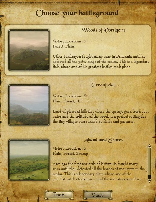 敵の構成は軽歩兵4、騎兵2重歩兵2と、森林を選んでも草原を選んでも大差ない。自軍は軽歩兵2しかいない、というのはややディスアドバンテージだが、その分弓兵がこちらの方が多いのでどうとでもなる。今回は特徴的な地形のある戦場があるので、それを選ぼう。Woods of Vortigernの絵の中に