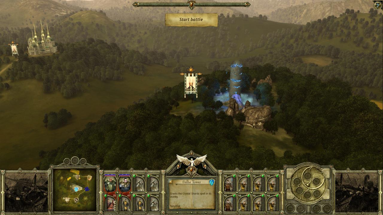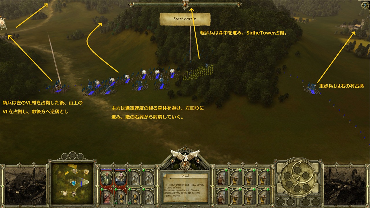 戦術はこんな感じ。敵は軽歩兵4に対しこちらは2。森林内での戦いはやや不利だが、Sidhe Towerはやや重要な拠点と言えるので、このような戦術に。
