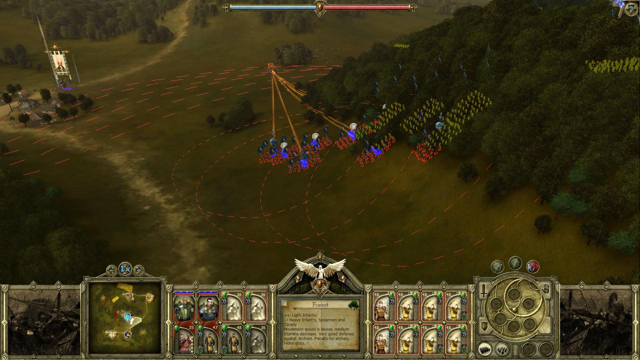 自軍は、森の中にいる右翼の進軍速度が遅く、森から出て移動している左翼(弓兵)は移動速度が速い。同様に、敵も森の中を進んでくる部隊(敵軍左翼)は進軍が遅く、平地を進んでくる部隊(敵軍右翼)は速い。よって、敵軍右翼から順番に集中砲火を浴びせてゆく。